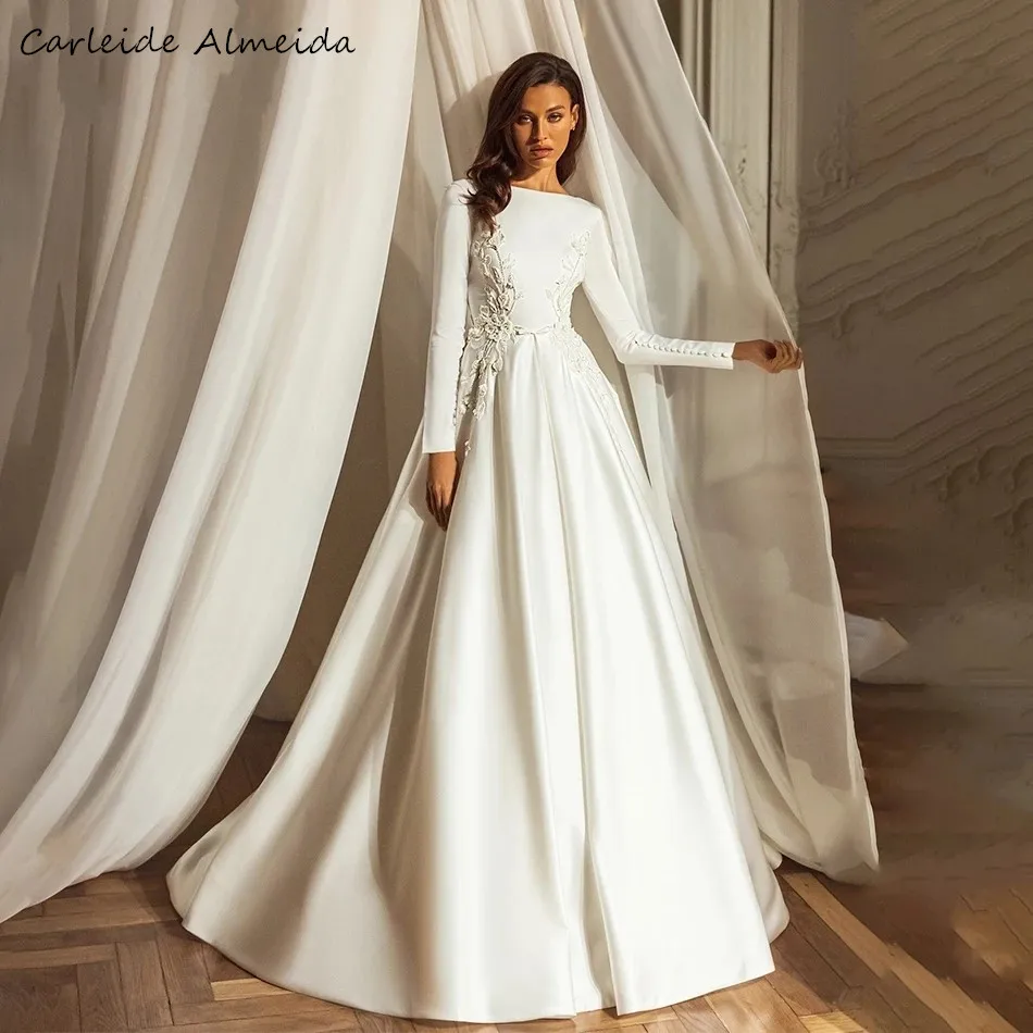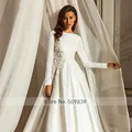 A-Line Muslim Wedding Dress 2021 Elegant Scoop Long Sleeves Satin Bride Delicate Beaded Appliques Princess Bridal Gowns