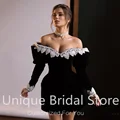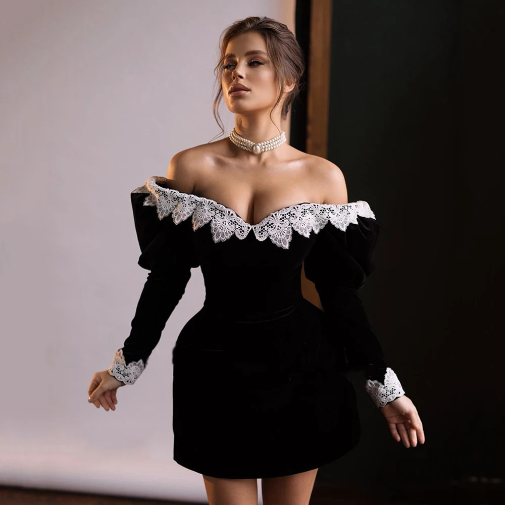 Unique Black Off Shoulder Prom Dress Long Sleeves Lace Mini Homecoming Dresses Open Back Above Knee Formal Gowns